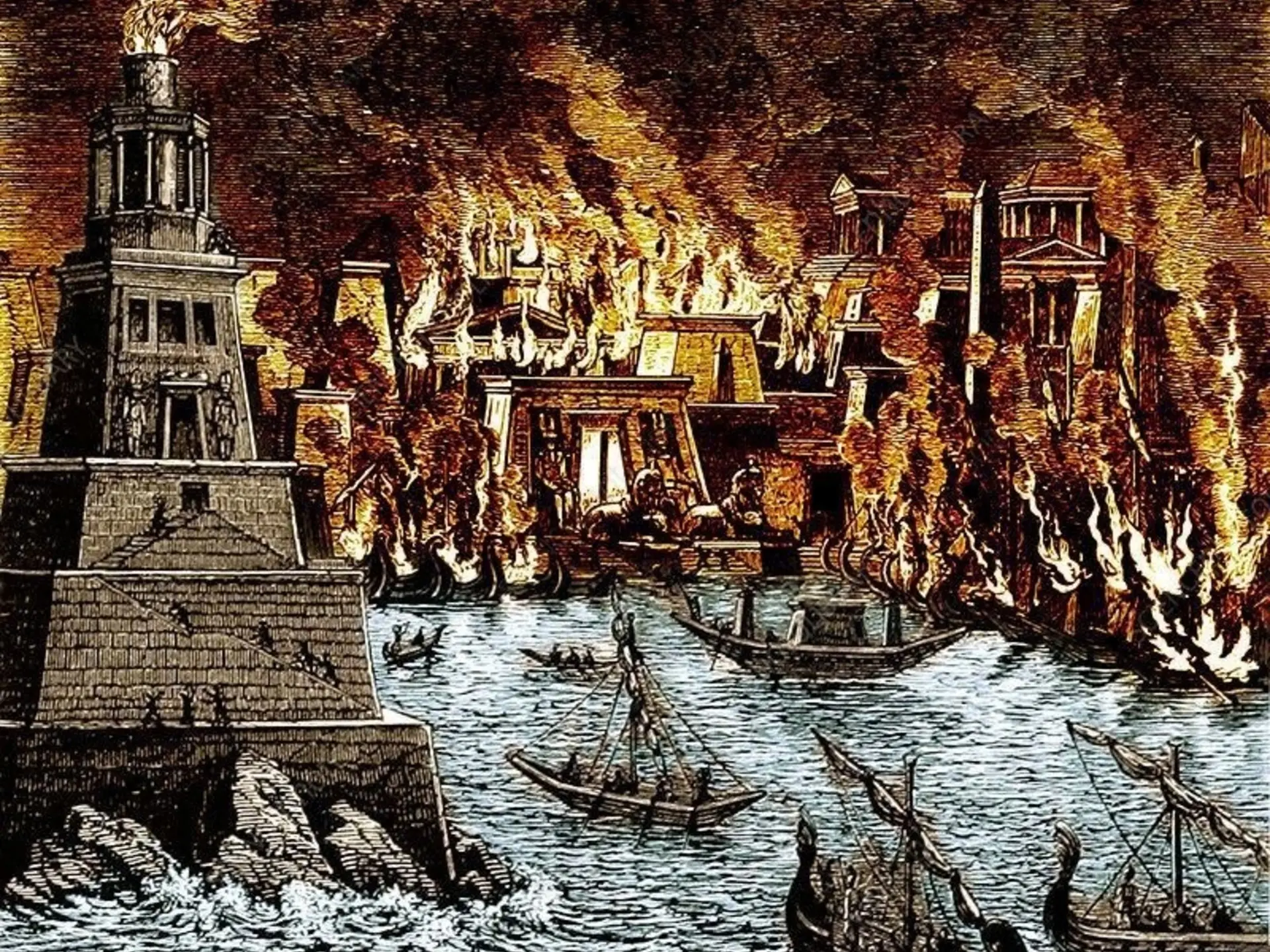 기원전 48년, 내전 동안 줄리우스 카이사르는 알렉산드리아 항구의 배들을 불태웠다. 불이 퍼졌다.