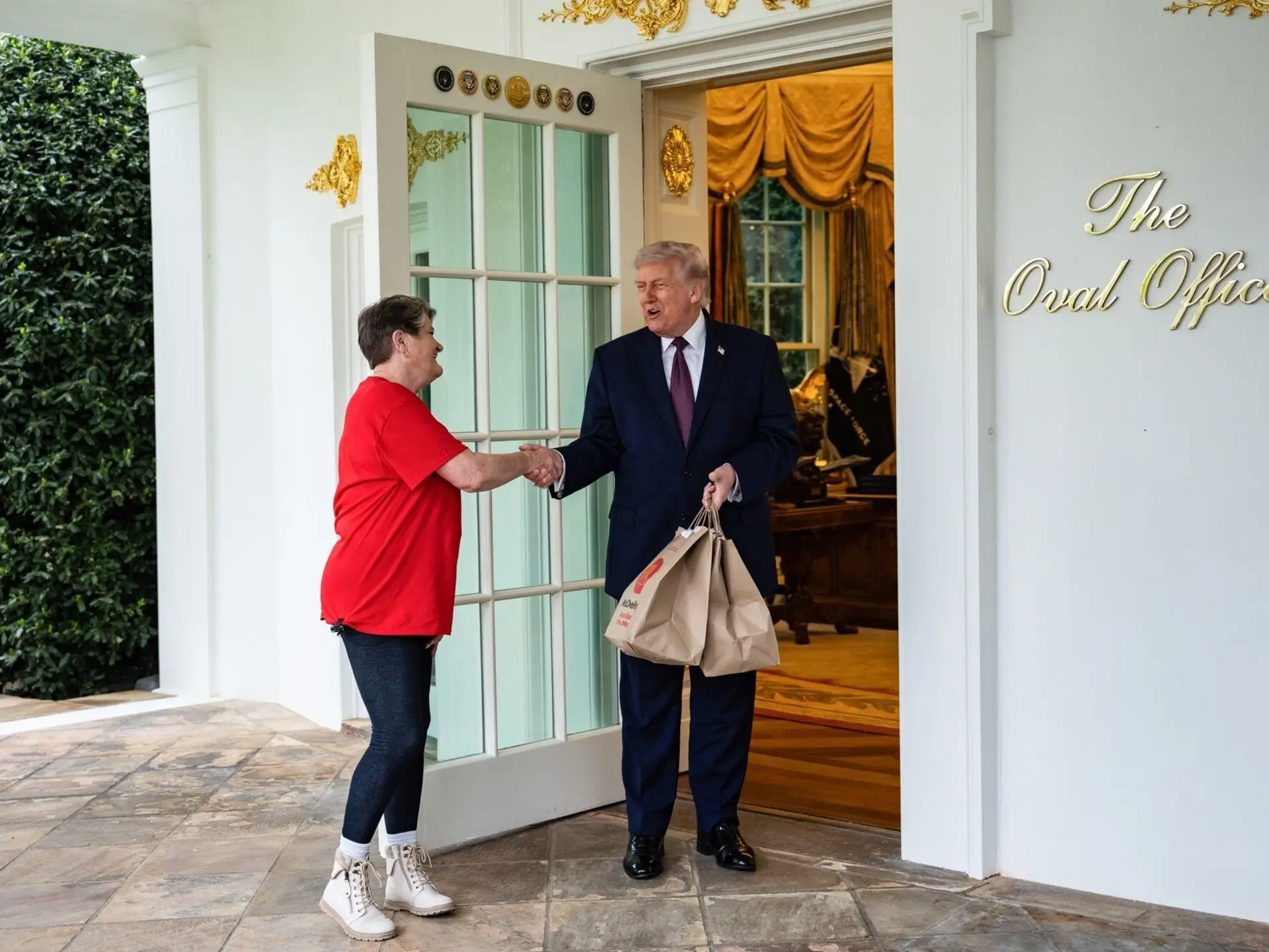 백악관 역사상 처음으로 맥도날드 배달원, 이번에는 여성,이 집무실 문을 두드렸고 도널드 트럼프가 직접 응대했다.