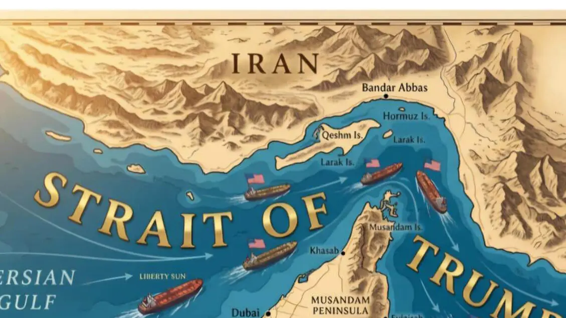 미국의 도널드 트럼프 대통령은 자신의 Truth 프로필에 호르무즈 해협 지도를 다시 게시했으며, 분쟁이 있는 해협이 '트럼프 해협'으로 개명되었다. 이미지에는 또한 별과 줄무늬 깃발을 가진 유조선들이 해협을 통해 쉽게 통과하는 것으로 보인다.