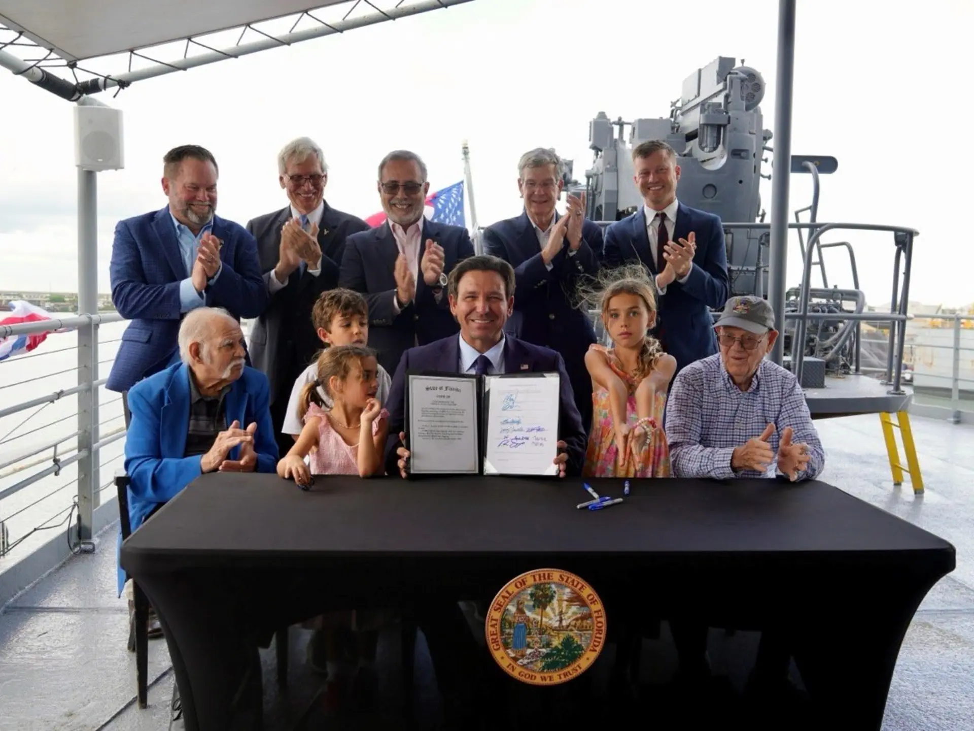Más simbólica que las anteriores, la ley HB-249 designa al SS American Victory como el nuevo buque insignia del estado. Al firmar la norma, DeSantis expresó: “Este histórico buque de vapor es uno de los pocos barcos de la clase Victory que aún se conservan”.
