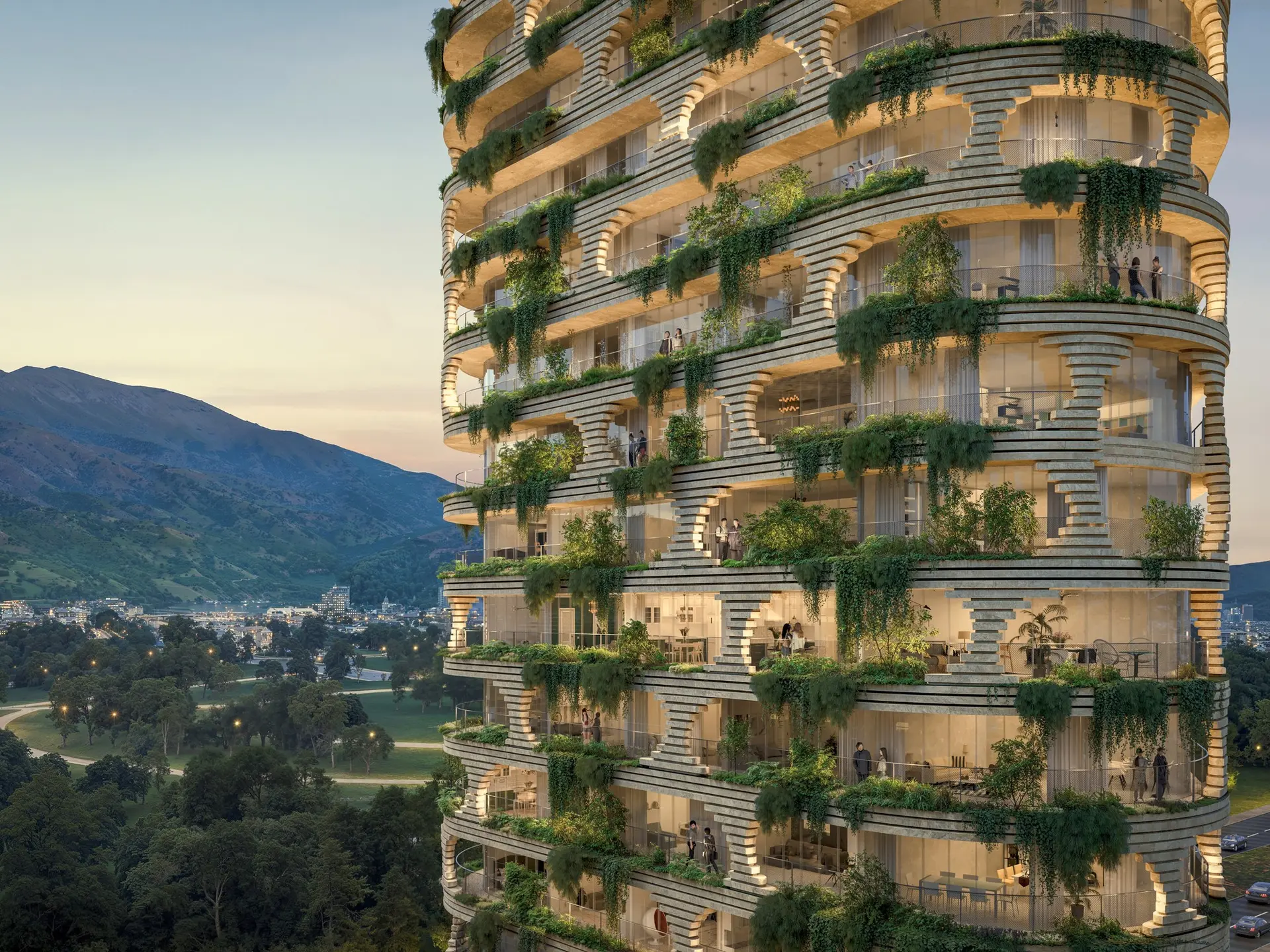 바닥부터 천장까지의 대창문은 거주 공간과 산악 풍경 사이의 시각적 연속성을 보장하며, 실내와 실외의 경계를 해소한다. 이 프로젝트는 공원 맞은편의 위치를 활용하여 도시의 수평선을 향해 녹색 생태계를 확장할 수직 연결자로 작용한다.