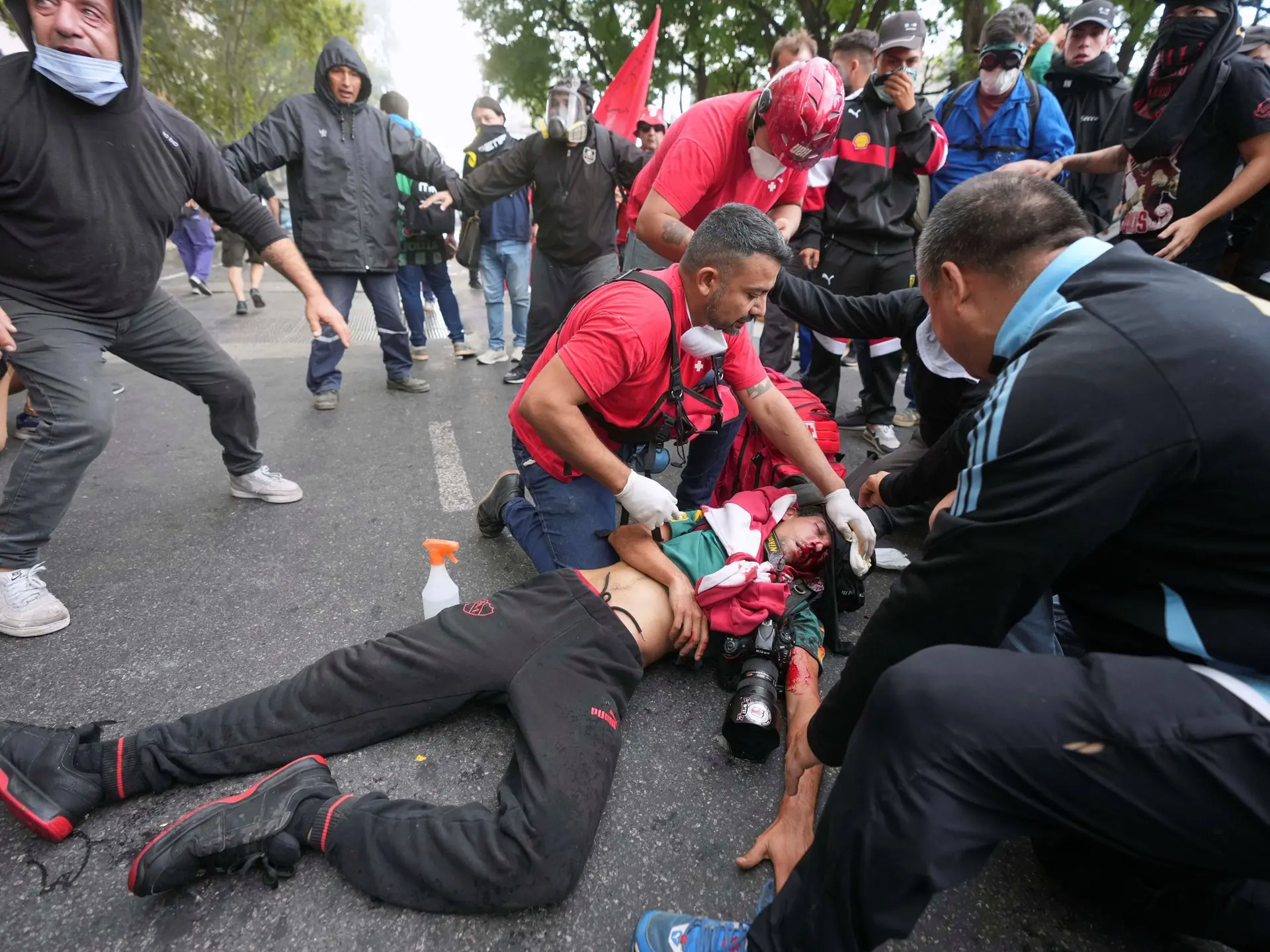 작년 3월, 포토저널리스트 파블로 그릴로는 국회 앞 은퇴자 시위 취재 중 헌병의 최루탄 발사로 머리에 심각한 상처를 입었습니다.