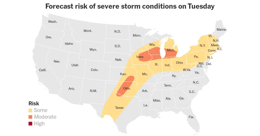 On Tuesday, forecasters at the Storm Prediction Center said the most significant risk fell in a bull’s-eye-shaped area of the Upper Midwest, and included the cities of Chicago, Milwaukee, Des Moines and Minneapolis. A separate area is centered over Texas, Kansas and Oklahoma, including Oklahoma City and Wichita, Kan. Forecasters are also closely watching a part of the Northeast that includes parts of New York, Vermont, New Hampshire and Massachusetts.Numerous thunderstorms are possible across the Midwest. Forecasters said there was a medium probability that the worst storms were likely to occur in a corridor between Des Moines and Milwaukee.
