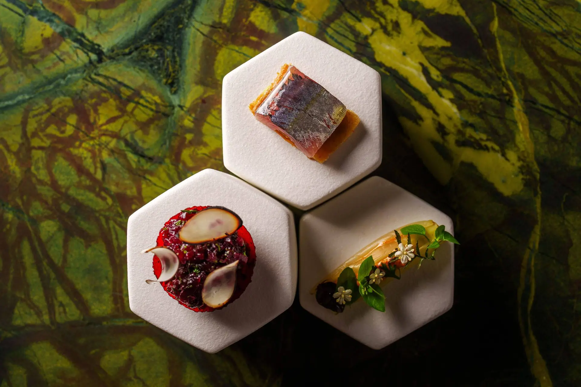 진미들도 빠지지 않는다—가리비, 굴, 카라비네이로 새우, 그리고 세계에서 가장 비싼 참치인 블루핀이 새로 출시된 디너 코스 오리운드 OR 2026.1의 주역이다.