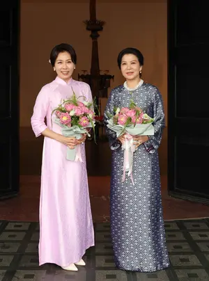Kim wore a pink ao dai, Vietnam's traditional dress, which she received as a return gift from Ly, who had been presented with traditional Korean clothing, hanbok, during her visit to South Korea in August 2025.