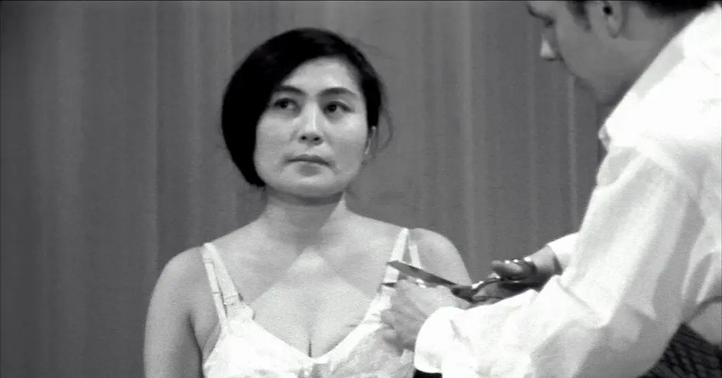 Ono was making her early work amid the first stirrings of second-wave feminism; the introduction of the birth control pill in 1960, combined with the publication of Betty Friedan’s “The Feminine Mystique” in 1963, lit the kindling of widespread discontent among postwar American women. In the 1950s and early ’60s, women were expected to suit themselves up in the suffocating corset of domesticity. Until 1974, unmarried women were often required to have a male co-signer when applying for a bank loan or credit card. Abortion was only legal in a handful of states by 1970, and sexual harassment, though pervasive, did not yet have a name. It’s this unnamed menace, I’d argue, that Ono so cleverly countenances in “Cut Piece.”