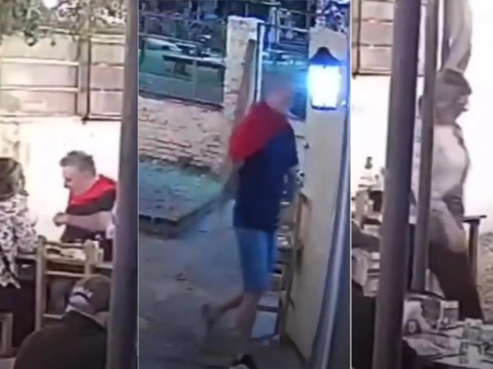 El foco de la cámara de seguridad vuelve a posarse sobre la pareja. Primero el hombre se para, vestido con una remera oscura y un buzo rojizo atado en los hombros. Haciéndose el distraído, se dirige hacia uno de los costados del patio. La filmación lo muestra yéndose.