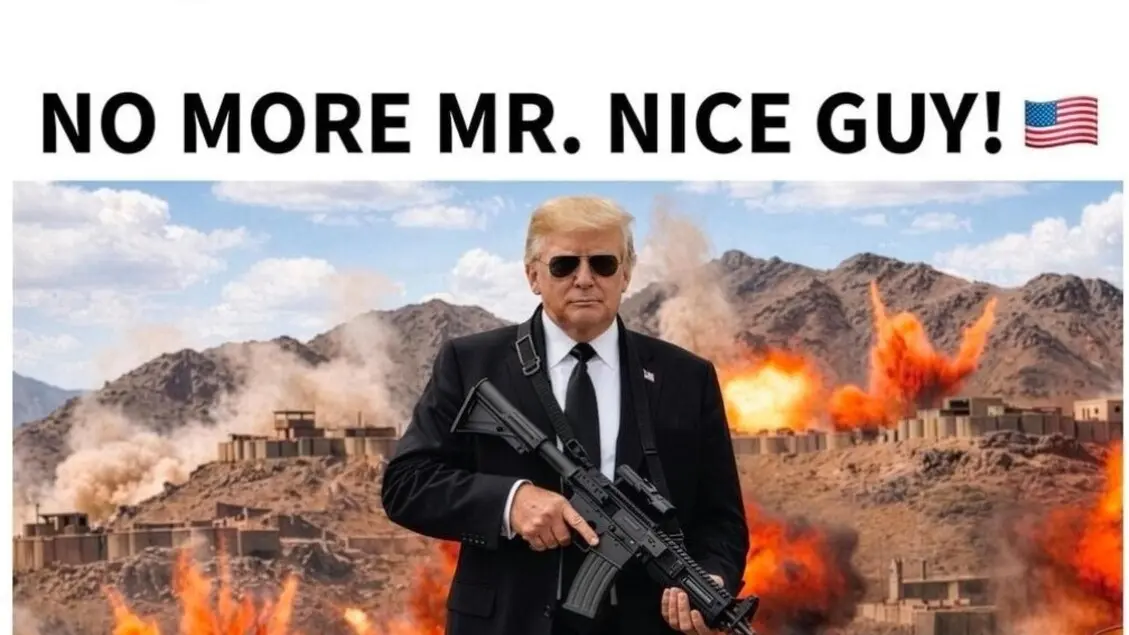 Il post, pubblicato quando a Washington sono le 4 del mattino, è accompagnato da un'immagine evidentemente generata dall'intelligenza artificiale che lo ritrae mentre impugna una mitragliatrice in piedi di fronte a una catena montuosa sconvolta dalle esplosioni.