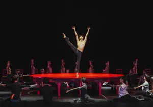 He described the central image — a soloist on a table encircled by 38 dancers — as open to interpretation. The table might be seen as an altar, the ensemble as encroaching forces, even predators. "It can feel as if the dancer knows their fate and continues regardless," he said.